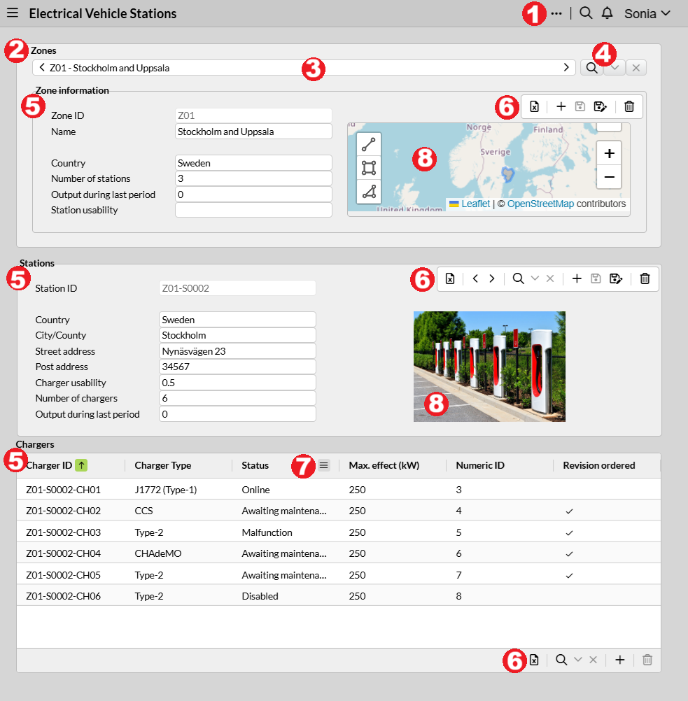 Multiple records of a table and their fields are displayed as rows and columns. Mainly used to have an overview of the records of a table. Can also be used to select a record to be displayed on another section type (for instance, to edit it or to provide more information about it). In the image above, the section called "Chargers" is a Table section.
